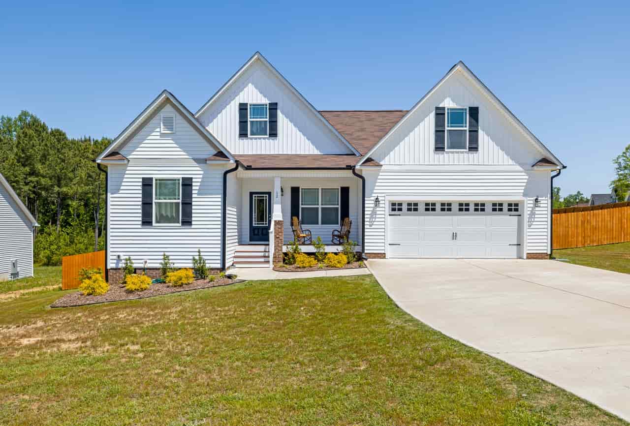 This front yard entry and driveway landscaping style combines xeriscaping and concrete without any lawn to get its look and atmosphere. The driveway and front entryway are very inviting, roomy, and leave no doubt to where the front door is. Made from stained stamped concrete, it adds so much more than plain concrete could do. If your budget allows, decorative concrete is the way to go. If not, it's worth saving up for.